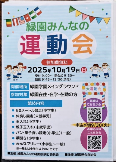 緑園みんなの運動会が10月19日(日)に緑園学園メイングラウンドで開かれました。すっかり秋らしくなり、緑園地区に在住・在学・在勤の皆さんが、家族総出やおひとりで、子どもたちが仲間と一緒に、それぞれ大勢の方々が参加し、普段あまり体を動かさい方は、この時とばかり、体を動かしている方もおられました。