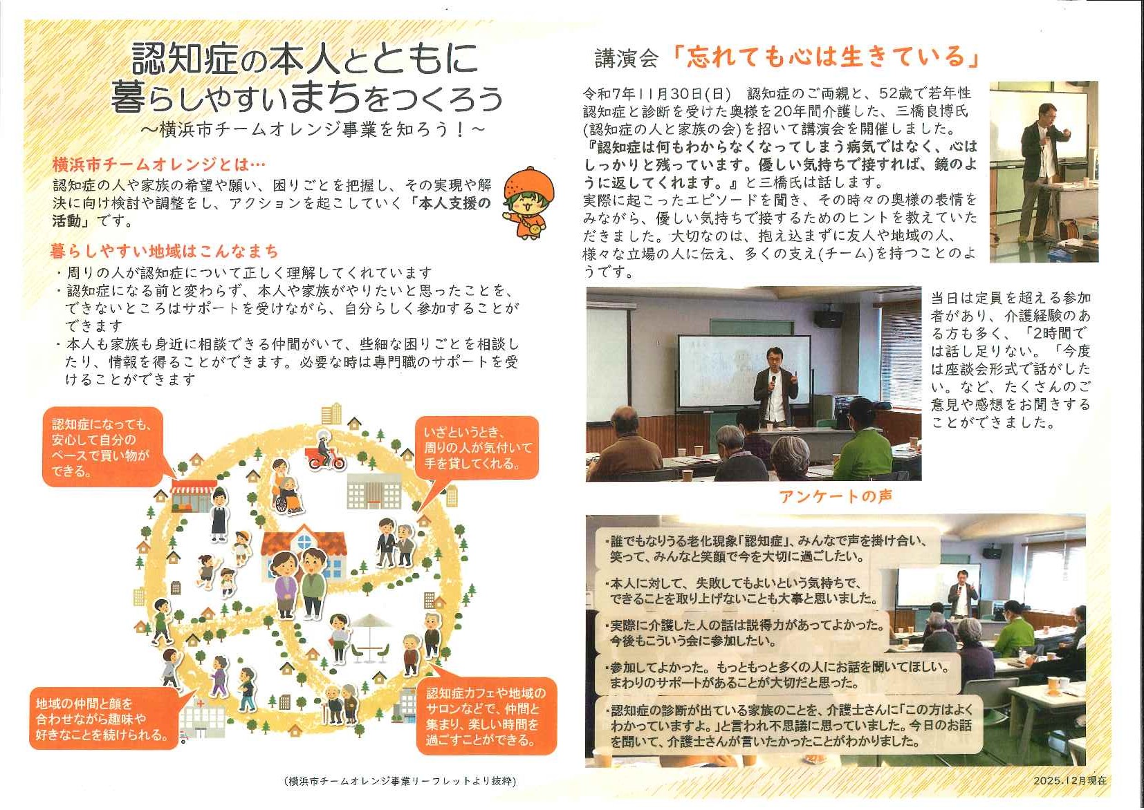 緑園地区社協は2月22日(日)第4期地区社会福祉保健計画研修会を緑園地域交流センターで開催、伊藤会長挨拶に続き、①当地区民児協の中村会長から「当地区の現状について」、②伊藤会長から第5期(当地区わくわくプラン」の概要について、③特別講座「忘れても、心は生きている」を認知症の妻を介護する家族の話」を長年の介護の経験をもとに「認知症の人と家族の会:」神奈川支部副代表の三橋良博氏が講話された。